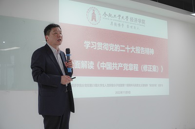11月9日下午,yl23455永利官网分团校暨第11期青年马克思主义者培养“经世济民”班在翡翠科教楼B座1004室开展第一次专题理论学习。学院党委书记张炳武以“学习贯彻党的二十大报告精神,全面解读《中国共产党章程(修正案)》”为题,讲授了一场主题团课,“经世济民”班全体学员参加了此次集中学习。